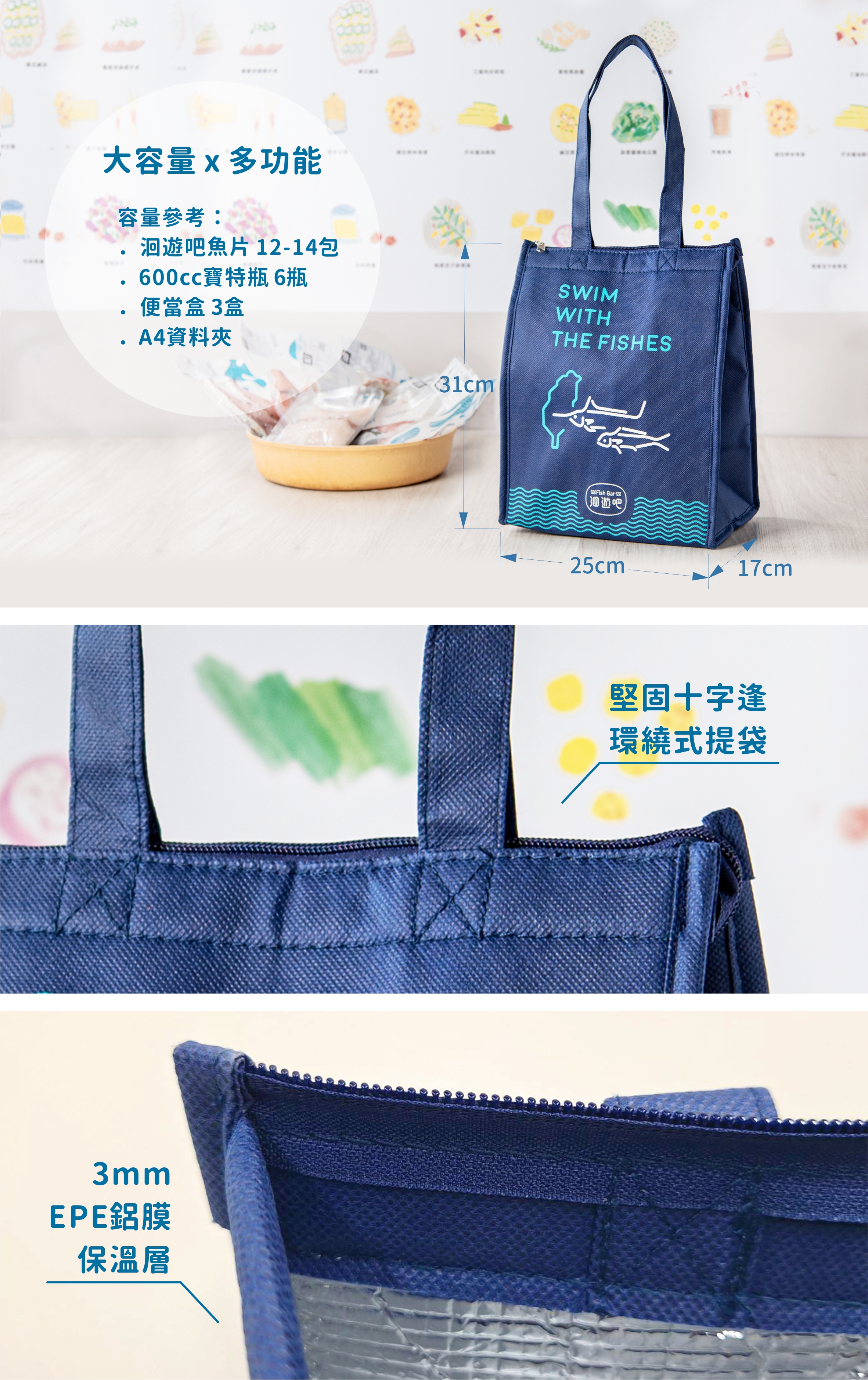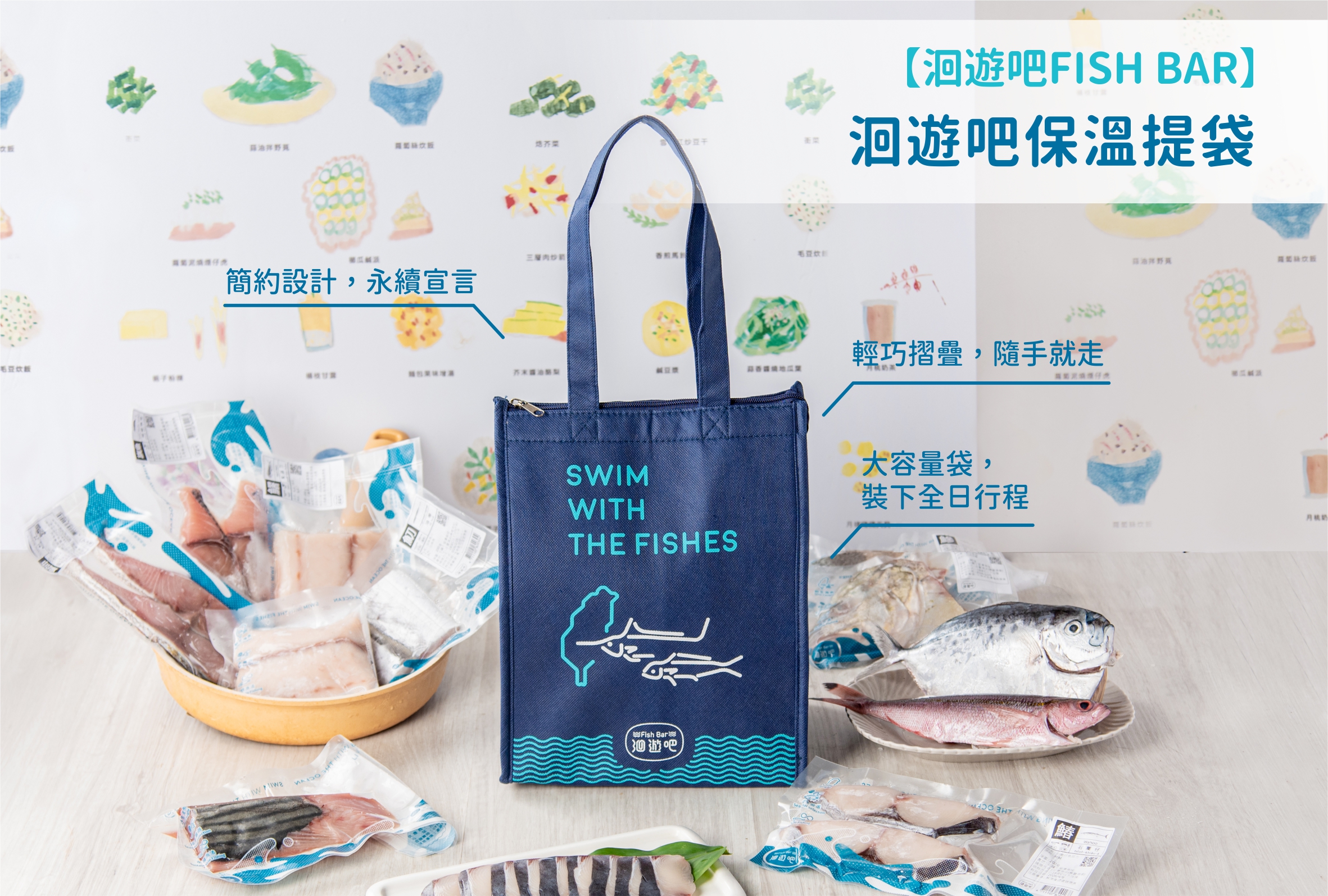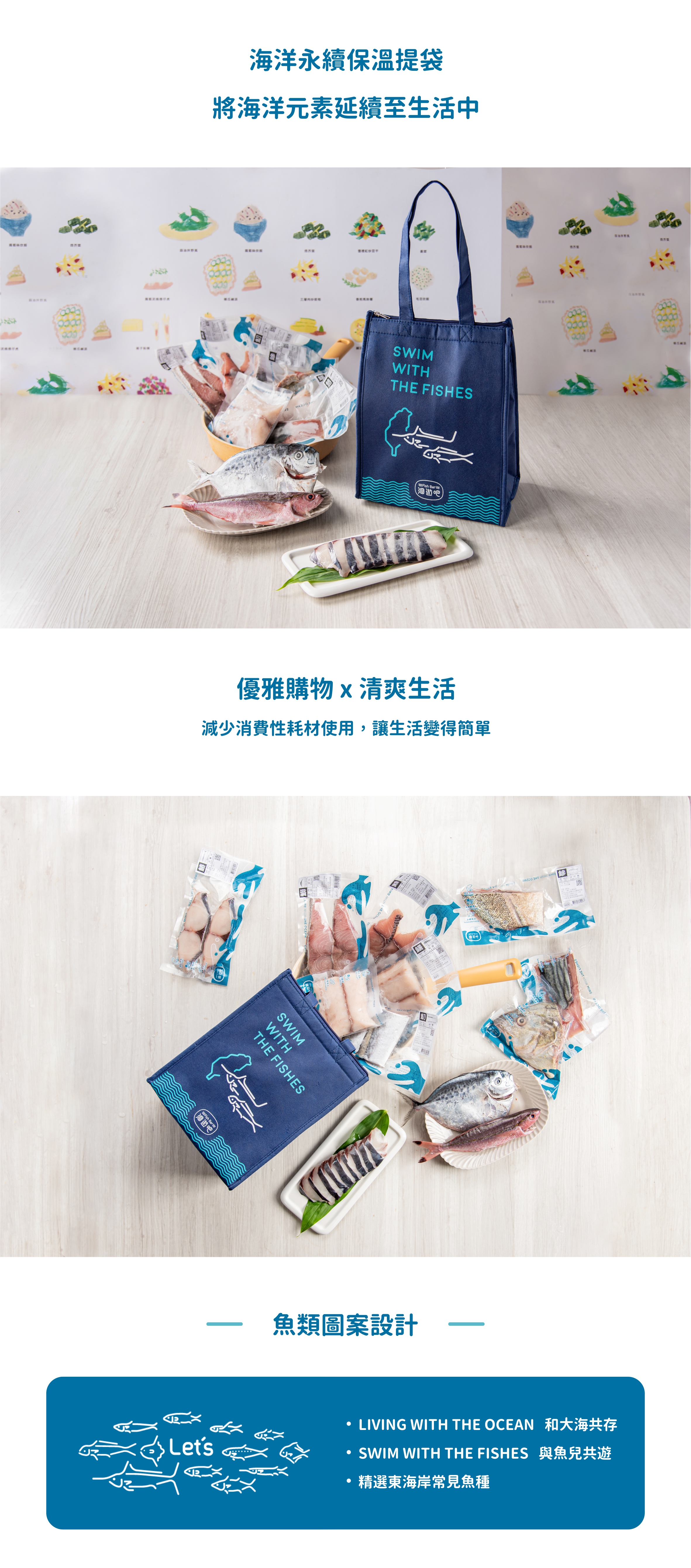 ◆ 東部魚種 × 簡約設計:東部海魚躍上袋身,搭配標語「LIVING WITH THE OCEAN|SWIM WITH THE FISHES」